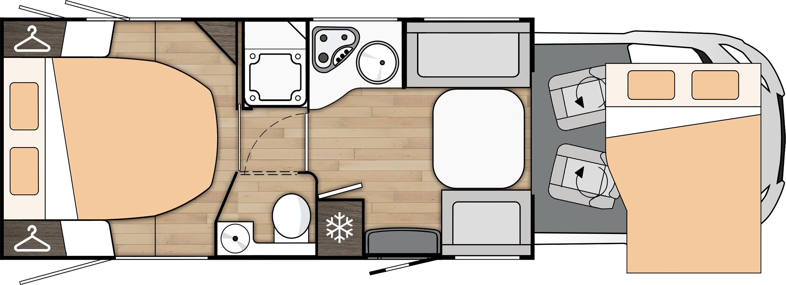 CategoríaElementos DestacadosConstrucciónTecnología "Paredes y techo imputrescibles" (sin listones de madera).Carrocería, cara inferior del suelo y cabeza perfilada de poliéster (PRFV).Exterior/AccesoPuerta de célula (entrada) XL de 2 puntos de cierre, con ventana, mosquitera y papelera.Claraboya panorámica practicable en cabina (con mosquitera y oscurecedor).Ventanas doble vidrio Dometic D-Lux.Luz exterior LED.Sensores de aparcamiento traseros (en modelos UP y otros).AlmacenamientoGaraje con 2 portones (en modelos con cama trasera transversal/gemelas/isla).Tomas de 230V/12V en el garaje.Cerraduras de portones tipo automoción.